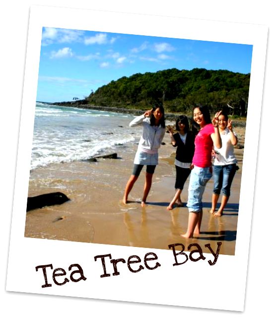 Kurumi and Aya from Japan took a swim at Tea Tree Bay while the others strolled the beach, wrote in the sand, sun bathed and explored the mossy rocks for marine life.